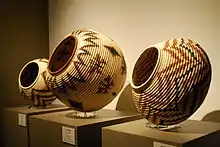 Basketry made with reeds and rushes is done in various regions in the state of Oaxaca, such as the Central Valleys, the Miahuatlán Valley, the Mixtec region and Tehuantepec, mostly baskets for the transport of merchandise.[4] Most of these wares originally were for carrying merchandise to market, along with petates and tenates. From the mid 1980s, Oaxacan basketry, especially in the Central Valleys as incorporated Asian elements into their designs. Amador Martinez went to China to learn bamboo basketry. When he returned, he taught other artisans what he had learned. The new forms have also been incorporated in the basketry workshops of the prisons in Tlacolula and Ocotlán. The new forms and decorations have had steady levels of increasing acceptance in the region.[1]
