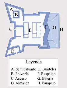 The battery could house an infantry garrison of fifteen men and one officer, six gunners and a corporal, as well as four men and a corporal of the cavalry. By 1796, the battery had only ten men and two gunners. The Spanish fortifications around Gibraltar were completely destroyed in 1810 by Sir Charles Holloway with the supposed agreement of Spain to prevent them from falling into the hands of Napoleon's troops.[2]