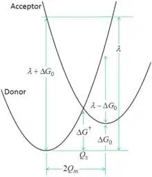 Marcus theory is a theory originally developed by Nobel laureate Rudolph A. Marcus and explains the rate at which an electron can move from one chemical species to another,[6] for this article this can be seen as 'jumping' from the electrode to a species in the solvent or vice versa. We can represent the problem as calculating the transfer rate for the transfer of an electron from donor to an acceptor
