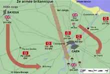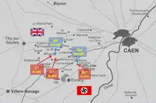Operation Perch was intended to create the threat of a British break-out to the south-east of Caen by XXX Corps, with the 50th (Northumbrian) Infantry Division capturing the road to Tilly-sur-Seulles.[40] The 7th Armoured Division would then spearhead the advance to Mont Pinçon.[41][42] On 9 June, Montgomery ordered that Caen be taken by a pincer movement.[43] The eastern arm of the attack would consist of I Corps with the 51st (Highland) Infantry Division, which was to cross into the Orne bridgehead and attack southwards to Cagny, 6 mi (9.7 km) south-east of Caen. XXX Corps would form the western arm of the pincer; the 7th Armoured Division would advance to the south-east and cross the Odon River, to capture Évrecy and Hill 112.[44][45] XXX Corps attacked Tilly-sur-Seulles against the Panzer Lehr Division and part of the 12th SS Panzer Division, which held Tilly despite many casualties on both sides.[46][47][48]