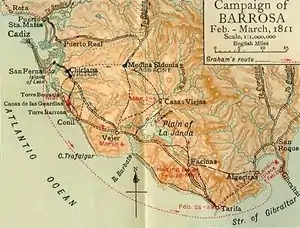 The Anglo-Portuguese contingent—a division commanded by Lieutenant-General Sir Thomas Graham—sailed from Cádiz on 21 February 1811, somewhat later than planned.[10] Graham's forces were unable to land at Tarifa due to bad weather and were forced to sail on to Algeciras, where they disembarked on 23 February.[11] Joined by a composite battalion of flank companies under Colonel Browne, the troops marched to Tarifa on 24 February, where they received further reinforcement from the fortress garrison there.[12] By 27 February, they were joined by la Peña's Spanish troops, who had left Cádiz three days after Graham and, despite encountering similar weather difficulties, had succeeded in landing at Tarifa.[10]
