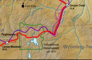 The Yellowstone River, above and below the mouth of Clark's Fork, is bounded on the north bank by cliffs about 400 feet (120 m) high. The one passage through the cliffs was Canyon Creek. Following the creek upstream through open country, about five miles (8 km) from the Yellowstone the cliffs close in on either side and the creek splits into three forks, each running through a canyon only a few hundred feet wide with smaller side canyons. The canyons are separated by steep flat-topped ridges 300 to 500 feet (90 to 150 m) high. The narrow canyons are about six miles (10 km) long and lead to open prairie above.[4] It was among these multiple canyons and the ridges surmounting them that the battle took place.