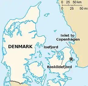 Frustrated by the delay, Nelson sent a letter to Captain Thomas Troubridge, a friend and a Lord Commissioner of the Admiralty.[6] This prompted the Earl of St Vincent (First Lord of the Admiralty) to send a private note, which resulted in the fleet sailing from Yarmouth on 12 March.[7] Orders were sent to Parker to go to Copenhagen and detach Denmark from the league by "amicable arrangement or by actual hostilities", to be followed by "an immediate and vigorous attack" on the Russians at Reval and then Kronstadt.[8] The British fleet reached the Skaw (Danish: Skagen) on 19 March, where they met a British diplomat, Nicholas Vansittart,[9] who told them that the Danes had rejected an ultimatum.