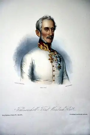 After the fighting on 4 April, Jelačić, the Ban of Croatia, claimed to Windisch-Grätz that he had actually been victorious, which misled the Field Marshal into ordering him to pursue the Hungarians. Rather than fleeing, the Hungarians were closing in on Windisch-Grätz's headquarters at Gödöllő, even as he was planning an attack on them for the following morning.[10] On 5 April he sent two companies of lancers, two companies of light horse and two rockets under the command of Lieutenant General Franz Liechtenstein on a reconnaissance mission to Hatvan.[11] After a skirmish with four companies of Hungarian hussars, in which the Hungarians retreated, Windisch-Grätz started to suspect that at Hatvan station smaller Hungarian forces, but instead of sending superior forces to defeat them, and push towards Debrecen, or to gather all his forces around Gödöllő, he did quite the opposite.[12] Fearing that the Hungarian main forces would get around him from the south and cut his lines to the capital, or from the north and liberate the fortress of Komárom from the Austrian siege, he sent the Austrian III Corps to Gödöllő and I Corps southwards to Isaszeg. Two brigades of the Austrian II Corps were also sent to Vác, and Lieutenant General Georg Heinrich Ramberg ordered to join him with his brigade; two brigades remained in Pest.[13] Windisch-Grätz had scattered his forces over 54 km (34 mi), too far apart for mutual support.[13]