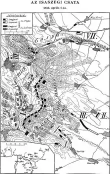 On 2 April, the preliminary fighting began when the VII Corps clashed with the Austrian III Corps at the Battle of Hatvan. Schlik had wanted to obtain information for Windisch-Grätz about the positions and numbers of the Hungarian army and had moved towards Hatvan but was defeated there by the VII Corps and forced to withdraw without accomplishing his purpose. Windisch-Grätz assumed that Schlik had come up against the main Hungarian army and remained ignorant of the true whereabouts of the Hungarian army.[8] The other three Hungarian corps moved south-west as planned and on 4 April met and defeated the Austrian I Corps at the Battle of Tápióbicske. Although Klapka's attack at Tápióbicske had revealed where the Hungarian troops really were, Görgei decided to continue with the plan.[9]