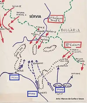 - Second Army, under Stepa Stepanović, composed of one Serbian and one Bulgarian division (74,000 men), deployed in the area around Kyustendil, was assigned to the easternmost attack, with the objective of attacking the right flank of the enemy.[7]