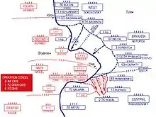 Operation Citadel called for a double envelopment, directed at Kursk, to surround the Soviet defenders of five armies and seal off the salient.[80] Army Group Centre would provide General Walter Model's 9th Army to form the northern pincer. It would cut through the northern face of the salient, driving south to the hills east of Kursk, securing the rail line from Soviet attack.[81] Army Group South would commit the 4th Panzer Army, under Hermann Hoth, and Army Detachment Kempf, under Werner Kempf, to pierce the southern face of the salient. This force would drive north to meet the 9th Army east of Kursk.[82][83] Manstein's main attack was to be delivered by Hoth's 4th Panzer Army, spearheaded by the II SS Panzer Corps under Paul Hausser. The XLVIII Panzer Corps, commanded by Otto von Knobelsdorff, would advance on the left while Army Detachment Kempf would advance on the right.[84] The 2nd Army, under the command of Walter Weiss, would contain the western portion of the salient.[85][83]