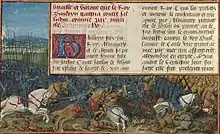 The Battle of Montgisard was fought between the Kingdom of Jerusalem and the Ayyubid Dynasty on 25 November 1177 at Montgisard, in the Levant between Ramla and Yibna.[4] The 16-year-old Baldwin IV of Jerusalem, seriously afflicted by leprosy, led an outnumbered Christian forces against Saladin's troops in what became one of the most notable engagements of the Crusades. The Muslim army was quickly routed and pursued for twelve miles.[5] Saladin fled back to Cairo, reaching the city on 8 December, with only a tenth of his army.[2] Muslim historians considered Saladin's defeat to be so severe that it was only redeemed by his victory ten years later at the Battle of Cresson and the Battle of Hattin in 1187, although Saladin defeated Baldwin IV in the Battle of Marj Ayyun and the Siege of Jacob’s Ford in 1179, only to be defeated by Baldwin IV again at the Battle of Belvoir Castle in 1182 and the Siege of Kerak in 1183.[2]
