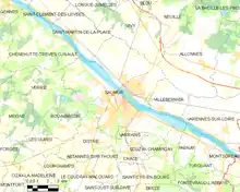 The front comprised to the west, the town of Gennes on the south bank, with double suspension bridges connecting the north via an island. The north bank comprised a levee, which extended east for the whole of the 40 km front, behind which is a lower old flood plain. Small villages built into the southern bank cliffs, overlooking the river and a number of islands in the river, filled the 20 km until Saumur which had another double bridge of stone via the Offard island which is 1.5 km by 0.5 km and was covered in buildings, overlooked by the ancient Château de Saumur. A rail line over a bridge just to the east of Saumur entered a tunnel into the cliffs on the south bank. Another 20 km further east, along which there were a number of small villages, also built into the cliffs overlooking the river and more small islands is the town of Montsoreau with a truss road bridge across the river.