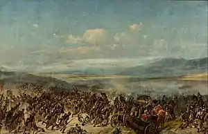 Meanwhile, the patrol sent by Lüders towards Marosvásárhely returned, reporting to him that no Hungarian troops would come from that direction.[5] Thus understanding that he could attack Bem's army with all his troops, he went from the left wing to the center to take over his troops from Ivin.[11] During these events Bem decided to make the decisive move to obtain victory, so he sent three infantry companies from his right wing on the left wing to join the attack in the Segesvár forest. On his left wing only three infantry companies and three and a half cavalry companies remained.[13] Lüders observed that Bem strengthened his left wing, weakening his right, so he sent two Jäger companies and a half light battery, which arrived around 5 p.m. to reinforce his left wing. At the same time, he replaced his artillery from the center with six guns of a heavy battery. At 4 p.m. Lüders sent four Uhlan companies and a half-light battery against the Hungarian right wing.[14] At 5 p.m. the Russian artillery hit and destroyed Bem's two ammunition wagons.[14] After the superior Russian artillery defeated the crippled Hungarian artillery, Lüders decided to apply the decisive blow, so he ordered a cavalry charge against the Hungarian right flank under the command of General Dimidov.[5]