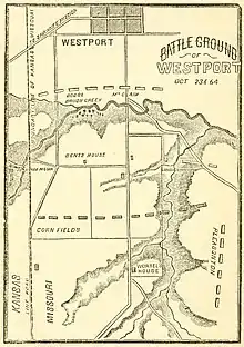 The Battle of Westport, sometimes referred to as the "Gettysburg of the West", was fought on October 23, 1864, in modern Kansas City, Missouri, during the American Civil War. Union forces under Major General Samuel R. Curtis decisively defeated an outnumbered Confederate force under Major General Sterling Price. This engagement was the turning point of Price's Missouri Expedition, forcing his army to retreat. The battle ended the last major Confederate offensive west of the Mississippi River, and for the remainder of the war the United States Army maintained solid control over most of Missouri. This battle was one of the largest to be fought west of the Mississippi River, with over 30,000 men engaged.