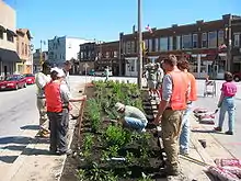 One of the group's original projects was the Bay View Firehouse garden at Milwaukee Fire Department Engine 11, located at 2526 S. Kinnickinnic Avenue.[5] In 2002, the group planted and maintained gardens at the Beulah Brinton Community Center, and installed a Liberty Garden at the WWII Memorial on Kinnickinnic & Russell Avenues. In 2004, the group added new park benches and assumed the maintenance of the flower planters at the Pryor Avenue Iron Well.[6] In 2008, the group teamed up with the Bay View Neighborhood Association and the City of Milwaukee to tear out a concrete island and develop a garden in the median at the intersection of Kinnickinnic, Howell & Lincoln Avenues.[7][8]
