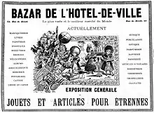 By 1870, Bazar Napoléon occupied all of the stores building on Rue de Rivoli. After the fall of the Second French Empire the store was renamed to "Bazar de l'Hôtel de Ville" referencing Hôtel de Ville across the street.[2][4]
