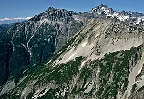 The history of the formation of the Cascade Mountains dates back millions of years ago to the late Eocene Epoch.[5] With the North American Plate overriding the Pacific Plate, episodes of volcanic igneous activity persisted.[5] In addition, small fragments of the oceanic and continental lithosphere called terranes created the North Cascades about 50 million years ago.[5]