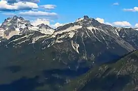 Bear Mountain is located in the marine west coast climate zone of western North America.[4] Most weather fronts originate in the Pacific Ocean, and travel northeast toward the Cascade Mountains. As fronts approach the North Cascades, they are forced upward by the peaks of the Cascade Range, causing them to drop their moisture in the form of rain or snowfall onto the Cascades. As a result, the west side of the North Cascades experiences high precipitation, especially during the winter months in the form of snowfall. During winter months, weather is usually cloudy, but, due to high pressure systems over the Pacific Ocean that intensify during summer months, there is often little or no cloud cover during the summer.[4] Because of maritime influence, snow tends to be wet and heavy, resulting in high avalanche danger.[4]