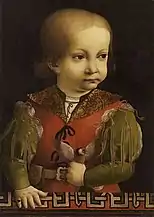 After a carefree year spent among many amusements, Beatrice found herself expecting a child. On 20 January 1493 Eleonora of Aragon returned to Milan to assist her daughter during childbirth and brought with her from Ferrara comare Frasina, the midwife of the family. Two days later at the Sala del Tesoro in the Rocchetta of the Castello Sforzesco the gifts of the Milanese nobility were exhibited on tables covered with crimson gold velvet, offered to the Moro in view of the imminent birth of his son.[25] Among these were "two beautiful diamonds" worth 18,000 ducats and a beautiful golden cradle, donated by his father-in-law Hercules. On 23 January Beatrice gave birth to her eldest son Hercules Maximilian, baptized after her father Hercules (Ercole), to whom she always had an unconditional love, and later named Maximilian in honour of the Emperor-elect Maximilian I.[26]