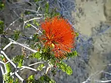 Beaufortia aestiva, commonly known as Kalbarri beaufortia,[2] or summer flame,[3] is a plant in the myrtle family, Myrtaceae and is endemic to the southwest of Western Australia. It is a dense, usually rounded shrub with small leaves and which bears yellow or red flowers in bottlebrush-like spikes near the ends of the branches in summer. It is similar to Beaufortia squarrosa but that is a smaller shrub which always has red flowers.