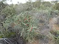 Beaufortia incana grows in kwongan and shrubland in the Avon Wheatbelt, Jarrah Forest, Mallee and Swan Coastal Plain biogeographic regions of south-western Western Australia. It grows in soils derived from laterite on hills and sandplains.[2][4][9]