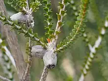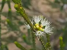 The flowers are pale pink to white and arranged in spherical heads on the ends of branches which continue to grow after flowering. The flowers have 5 sepals, 5 petals and 5 bundles of stamens. The stamen bundles, which give the flowers their colour, contain 9 to 15 stamens and are joined for more than half their length. Flowering occurs from July to November and is followed by fruits which are woody capsules.[2][3]