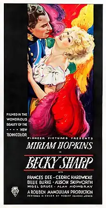 Becky Sharp is a 1935 American Technicolor historical drama film directed by Rouben Mamoulian and starring Miriam Hopkins who was nominated for the Best Actress Oscar. Other supporting cast were William Faversham, Frances Dee, Cedric Hardwicke, Billie Burke, Alison Skipworth, Nigel Bruce, and Alan Mowbray.