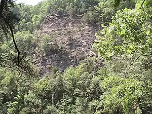 An upper section of the Bee Cliff approximately 100 meters above and adjacent to the Watauga River.