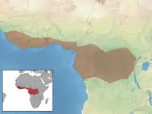 Beecroft's flying squirrel has a wide distribution in West and Central Africa. Its range extends from Senegal in the west to Nigeria, Cameroon and the Democratic Republic of Congo in the east, and southwards to Namibia, with a few records from Angola. Although native to virgin wet and dry forests, it is able to adapt to secondary forest, and occurs at altitudes of up to 2,500 m (8,200 ft). It seems to prefer swampy forests with palms, and also inhabits oil palm plantations and other cultivated areas.[1]