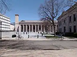 The Bicentennial Buildings–University Commons, the Memorial Rotunda, and Woolsey Hall–were the first buildings constructed for Yale University as opposed to one of its constituent entities (Yale College, Sheffield Scientific School, or others), reflecting a greater emphasis on central administration initiated by Presidents Timothy Dwight and Arthur Twining Hadley.[1] Constructed in 1901-2 for the University's bicentennial, the limestone Beaux-Arts buildings linked the College buildings on the Old Campus with the Sheffield Scientific buildings on Hillhouse Avenue.[2] They were designed by John M. Carrère and Thomas Hastings of Carrère and Hastings.
