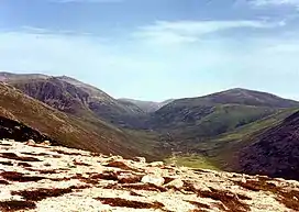![]() Looking up Glen Derry from the slopes of Derry Cairngorm with Beinn a' Chaorainn (right) and Beinn Mheadhoin (left). | |