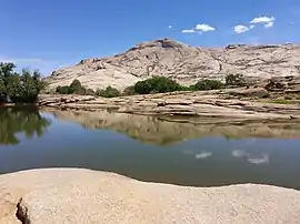 Bektauata is a small rocky range of moderate altitude located at the southern end of the Kazakh Upland system (Saryarka). The dry alluvial plain at the mouth of the Tokrau river lies to the east of the range. The nearest airport is Balkhash Airport.[2] There are rock formations, caves and rock pools in different spots of the Bektauata area. The largest cave is 48 meters (157 ft) in length. The inner part of the cave is full of water to a depth of 1.5 meters (4 ft 11 in).[1]