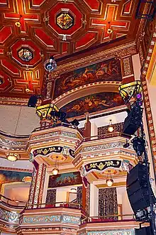 On either side of the stage is a wall section, which originally contained two boxes on either balcony level. The first balcony boxes had been removed before the 1980s,[37] but they were restored in 2010.[41][42] The boxes are supported on console brackets and contain angled railings with foliate decoration; a colonnette separates each pair of boxes. The boxes' wall sections are flanked by octagonal columns with capitals of stained glass, which support an arch with a molding.[37] At the tops of the boxes' wall sections are murals depicting love.[22] A staircase connects the orchestra level to the boxes on the east wall.[27]