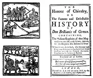 - Fernández, J. (1703). The honour of chivalry: or, The famous and delectable history of Don Bellianis of Greece. Containing the valiant exploits of that magnanimous and heroick prince: son unto the emperor Don Bellaneo of Greece ... Tr. out of Italian ... London: Printed for E. Tracy.
