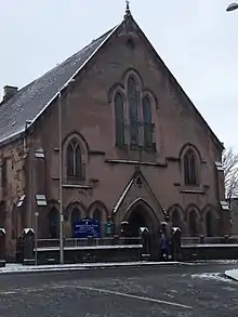 The main church building and hall was designed by David Clunas and constructed in 1874. It is described as a Gothic, gabled rectangular-plan church with set-back gabletted buttresses with pairs of Gothic rectangular windows with inverted rounded corners and vertical stone mullions, on both upper and lower levels. It is set back from the main road and the principal elevation has a pointed-arch timber panelled door to centre. Flanking hooded pointed-arch lancet windows; large hooded pointed-arch triple light window above with tracery and stone mullions. There is a cast iron decorative finial at the apex. BOUNDARY: small squared sandstone wall with saddleback coping and modern railings and gate furniture.