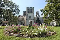 The house is a two-story, Gothic Revival style stuccoed brick residence with a three-story central cross gable. It features a square tower with corner piers, crenellation, belt courses, ground level Tudor arched openings, and diamond-paned casement windows. The roofline has clusters of circular and polygonal shaped chimney stacks and stepped gable ends. The kitchen outbuilding was incorporated into an extensive two- and three-story addition built by the school.