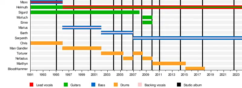 Belphegor was founded as Betrayer in 1991 by vocalist and bassist Maxx, guitarists Helmuth and Sigurd, and drummer Chris. The band released their first demo Kruzifixion in April 1991, and Unborn Blood later on.[2] After adopting the name Belphegor in 1993, they released another demo, Bloodbath in Paradise on Maxi-CD format. At somepoint before or after the release of this demo, Maxx departed from the band, resulting in Helmuth assuming his role as both vocalist and guitarist of Belphegor since. In between 1993 and 1996 session member A-X performed bass, after which bassist Mario "Marius" Klausner joined the band as a full-time member.