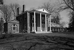 Belvidere is a large stone-and-brick mansion with a 2+1⁄2-story central block over a partial basement, a 2-story-over-basement east wing, and 1+1⁄2-story service wing. The house contains 30 rooms and 13 fireplaces. Also on the five-acre site are a nine-sided barn and hexagonal tea house, which was built in 1806.[2][3]