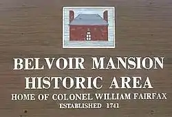 Belvoir was the plantation and estate of colonial Virginia's prominent William Fairfax family. Operated with the forced labor of enslaved people,[3][4] it sat on the west bank of the Potomac River in Fairfax County, Virginia, at the present site of Fort Belvoir. The main house — called Belvoir Manor or Belvoir Mansion — burned in 1783 and was destroyed during the War of 1812. The site has been listed on the National Register of Historic Places since 1973 [1] as "Belvoir Mansion Ruins and the Fairfax Grave."