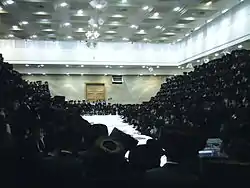 Like the original synagogue of Belz which took 15 years to complete, the new Beis HaMedrash HaGadol (Great Synagogue) that now dominates the northern Jerusalem skyline also took 15 years to construct and was dedicated in 2000. Its main sanctuary seats 6,000 worshipers (though crowds on the High Holy Days exceed 8,000), making it one of the largest Jewish houses of worship in the world. A huge ark has the capacity to hold 70 Torah scrolls. Nine chandeliers in the main synagogue each contain over 200,000 pieces of Czech crystal.