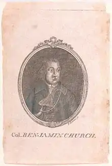 Colonel Benjamin Church (c.1639 – January 17, 1718) was an American military officer and politician who is best known for his role in developing military tactics and participating in numerous conflicts which involved the New England Colonies. He is also known for commanding one of the first ranger units in North America. Born in the Plymouth Colony, Church was commissioned by Governor Josiah Winslow to establish a company of rangers after the outbreak of King Philip's War in 1675. A force of New Englanders led by him was responsible for tracking down and killing Wampanoag sachem Metacomet, which played a major role in ending the conflict.[1][2]