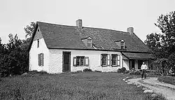 It is a one-and-a-half-story building of limestone rubble blocks white from lime washing. The gabled roof is shingled in asphalt; clapboard fills the gable fields on the side elevations. Two brick chimneys pierce the roof along with two gabled dormer windows in the center of the south side.[1]