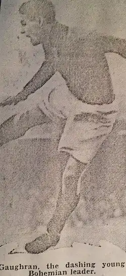 Charlie Harris, the Bohemians' trainer succeeded in inducing him to take up Association Football.[4] Gaughran believed that his rugby training gave him a good grounding for soccer and that "if one could kick an oval ball accurately there should be no great difficulty in learning how to control a round one."[6] After a few games with Bohemians' Leinster League team he made his debut for their Free State team against Waterford at Kilcohan Park and very soon attracted the attention of a number of cross-channel clubs. Arsenal were very keen to sign him towards the close of the 1935–36 season and sent their chief scout to sign him but they were unsuccessful.[4]