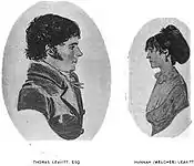 Benson Leavitt was born at Hampton Falls, New Hampshire, on June 21, 1797, the son of land surveyor Thomas [3] and his wife Hannah (Melcher) Leavitt.[4] Thomas Leavitt helped establish the Democratic party in New Hampshire, and helped lay out some towns in the northern part of the state.[5] Later, under President Andrew Jackson, the Democratic party came to control Hampton Falls, and Thomas Leavitt was chosen Town Clerk.[6]