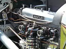 The essential difference between the Bentley 4½ Litre and the Blower was the addition of a Roots-type supercharger to the Blower engine by engineer Amherst Villiers, who had also produced the supercharger. W. O. Bentley, as chief engineer of the company he had founded, refused to allow the engine to be modified to incorporate the supercharger. As a result, the supercharger was placed at the end of the crankshaft, in front of the radiator. This gave the Blower Bentley an easily recognisable appearance and also increased the car's understeer due to the additional weight at the front.[16] A guard protected the two carburetters located at the compressor intake. Similar protection was used, both in the 4½ Litre and the Blower, for the fuel tank at the rear, because a flying stone punctured the 3 Litre of Frank Clement and John Duff during the first 24 Hours of Le Mans, which contributed to their defeat.[20][21]