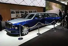 The Mulsanne nameplate was last used by Bentley for a four-door saloon that was built between 1980 and 1992. It was resurrected as the nameplate for what would become the replacement for the Arnage, Bentley's then flagship model. The new Mulsanne was unveiled at the 2009 Pebble Beach Concours d'Elegance held on 16 August,[8] followed by the 2009 Frankfurt Motor Show,[8] 2010 North American International Auto Show,[9] and the 2012 Qatar Motor Show.[10] At the time of its launch, a coupé and convertible variant were expected to follow at some point as replacements for the Arnage-based Brooklands and Azure respectively but the coupé never came to fruition,[11] while a convertible has been made available towards the end of the production run. Like the Arnage, the Mulsanne retains the 6.75 L (6,750 cc; 412 cu in) Bentley L Series V8 engine, modified to meet Euro V emissions regulations. The engine is lighter and features cylinder de-activation and variable cam phasing to improve fuel efficiency.[12] Unlike the less expensive Continental Flying Spur and Continental GT, the Mulsanne shares fewer common components with other marques in the Volkswagen Group.[13]