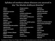 His book on occupational diseases, De Morbis Artificum Diatriba (Diseases of Workers) outlined the health hazards of chemicals, dust, metals, repetitive or violent motions, odd postures, and other disease-causative agents encountered by workers in more than fifty occupations.[6] This was one of the founding and seminal works of occupational medicine and played a substantial role in its development.[4] [5]