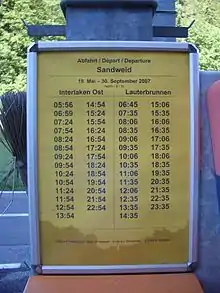 | Lauterbrunnen | 12.28 | 795 | connections to the Wengernalpbahn for Kleine Scheidegg via Wengen and the Bergbahn Lauterbrunnen-Mürren to Mürren |