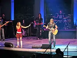 After removing the wig, Cyrus then reappeared to perform eight more songs as herself. She emerged from the bottom of the runaway to perform "Start All Over".[20] She was costumed by studded black jeans with chains attached to the waist,[25] a white tank top, a black leather vest and a matching glove.[19] She roamed throughout the stage, kicking over the microphone stand and banging her head.[25] "Good and Broken" and "See You Again", where Cyrus removed the vest and was joined by multiple backup dancers, rounded off the show's fourth segment.[17] She returned to the stage in a fuchsia bustier and short, black ruffled skirt to perform "Let's Dance", where she performed Latin-influenced choreography with backup dancers, and "Right Here".[17][19] Prior to Cyrus re-entering the stage for the sixth segment, backup singers sang a reworked version of Toni Basil's "Mickey" (1982) that replaced the word "Mickey" with "Miley".[26] Cyrus, costumed in a pink tank top, a plaid miniskirt and sneakers with high-knee socks,[17] performed "East Northumberland High", amid backup dancers dressed as skateboarders and football players.[20] Adding a black jacket, she sings "G.N.O. (Girl's Night Out)" with female dancers as her backup singers and concluded the main concert with the theme to Hannah Montana, "The Best of Both Worlds", a song credited to her alter ego.[17] The latter had Cyrus interacting with video that depicted Hannah Montana[27] and ended with the firing of confetti and fireworks.[21] Sporadically throughout the Best Both Worlds Tour, Cyrus returned on stage wearing a white tank top and denim jeans for the performance of a one-song encore, which was either "I Miss You" or "Ready, Set, Don't Go", a duet with her father Billy Ray Cyrus.[23] Both songs were performed in an acoustic setting, without dancers or special effects.[21][28] The prior had Cyrus performing acoustic guitar herself,[28] while the latter had her father doing so.[21]