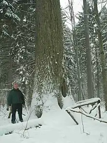 Environmentalists say that logging is threatening the flora and fauna in the forest, including species of rare birds, such as the white-backed woodpecker, who lost 30% of their population in forestry-managed areas in the 1990s and 2000s.[29] Poland's state forestry board claims the logging is for protection and for ecological reasons,[30] protecting against the European spruce bark beetle.[31] In 2012, the amount of wood that can be extracted by foresters annually was briefly reduced from about 120,000 m3 (4,200,000 cu ft) to 48,500 m3 (1,700,000 cu ft), approximately 20,000,000 board feet, most which is sold locally, mainly as firewood.