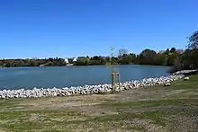 Biesdorfer Baggersee lies in a largely built-up area. A large filter system for rainwater is located a few meters west of its bank.[1] A 1,400 m (4,600 ft) long path runs around the quarry pond, which has several access points to the lake. The shore is overgrown with reeds, trees, and other vegetation on most parts of the lake. Only in the north is the shore area protected from entering by a fence. In the south of the lake, there are two separate sandy beaches, which are not approved for swimming. Several wooden loungers were installed at the lake and a volleyball court was created. The species of fish commonly found in the lake are carp, pike and roach.