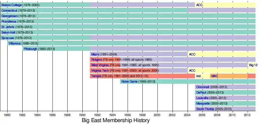 The Big East Conference was a collegiate athletics conference that consisted of as many as 16 universities in the eastern half of the United States from 1979 to 2013. The conference's members participated in 24 NCAA sports. The conference had a history of success at the national level in basketball throughout its history, while its shorter (1991 to 2013) football program, created by inviting one college and four other "associate members" (their football programs only) into the conference, resulted in two national championships.