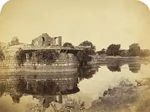 Asar Mahal or palace was constructed in 1646 by the Adil Shahis. It is located to the east of the citadel. A bridge connects it and it is well preserved. It is also known as Dad Mahal since it was initially used as hall of justice. It was later converted as reliquary and has become a highly revered place since it is said to hold two hairs from the beard of Prophet Mohammed. The portico has impressive wooden columns (four numbers of octagonal shape) and is double the normal height and has wooden panelled ceiling. It faces an artificial lake. The walls and ceiling of the hall display landscape paintings. Women are prohibited from entering this Mahal.[18][25][26] A picture of Assar Mahal, Beejapore by Thomas Boys was published in Fisher's Drawing Room Scrap Book, 1833 along with a poetical illustration by Letitia Elizabeth Landon (wrongly described as Ruins near Agra).[27]